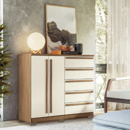 Cômoda 2 Portas Bater 5 Gavetas Málaga Gold Santos Andirá – Jatobá/Areia
