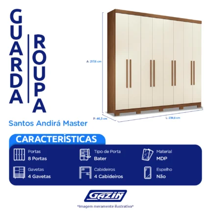 5 es Guarda-Roupa Casal 8 Portas Bater 4 Gavetas Master Santos Andirá - Jatobá/Areia Cód.