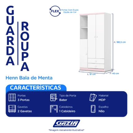 Guarda-Roupa Infantil 3 Portas Bater 2 Gavetas Bala de Menta Henn Roupeiro – Branco e Branco/Rosa Chá Flex
