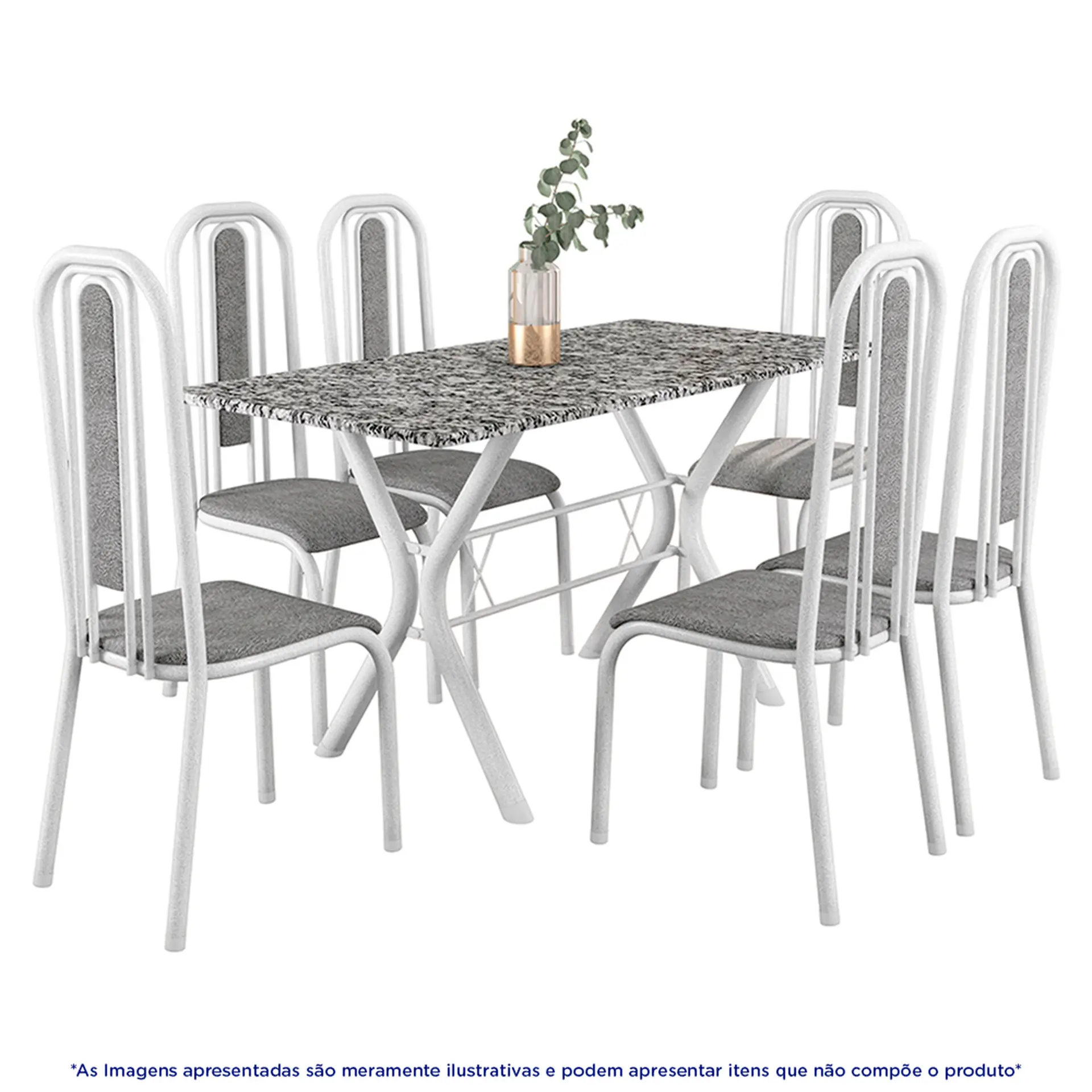 Início Moveis Mesas e Cadeiras Conjunto de Mesa 6 Cadeiras Tampo Granito Athenas Fabone – Branco Prata/ Vegetale