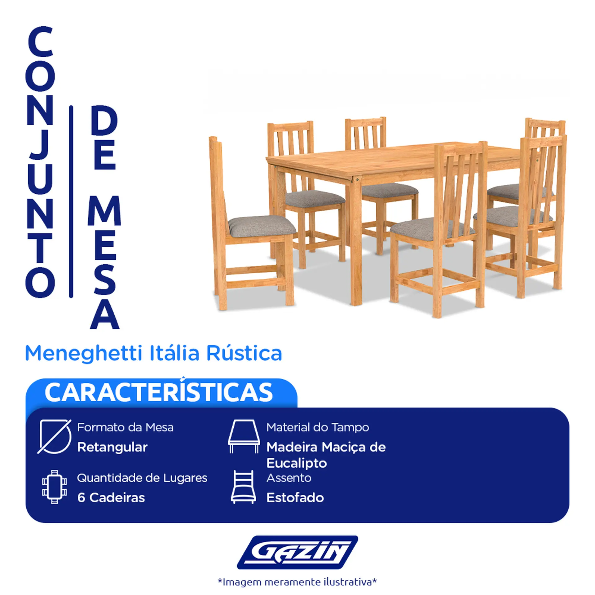 O Conjunto de Mesa Itália Rústico, é capaz de se encaixar e combinar com qualquer ambiente, o produto reúne estilo, praticidade e durabilidade. É o móvel que estava faltando no seu ambiente. Confira mais detalhes: O conforto e qualidade que você procuraCom 6 cadeiras, possuindo designer diferenciado, produzido em madeira maciça de eucalipto, as cadeira possui assentos com espuma D18 e acabamento em tecido de linho. Já a pintura tanto da mesa quando das cadeiras são feitas com cera mel que realça a beleza natural da madeira.Sobre a marca: qualidade MeneghettiA Meneghetti Móveis foi fundada no ano de 1994, e vem atuando no mercado moveleiro desde então, tendo sua sede no município de Sul Brasil, oeste de Santa Catarina. A fabricação dos móveis consiste em um processo efetivo de produção, iniciando no plantio das mudas de eucalipto e seu acompanhamento até o momento de retirada. A empresa apresenta plena consciência da importância da preservação do meio ambiente para o desenvolvimento humano, buscando a conservação das riquezas presentes na região para garantir uma maior sustentabilidade e um eficiente progresso ecológico. Sua história de sucesso é construída diariamente com muita dedicação, talento e confiança de seus colaborados e clientes, pessoas fundamentais para a sua trajetória. Hoje, com mais 27 anos de mercado, a Meneghetti Móveis se tornou referência em seu setor, atendendo em todo o território brasileiro e realizando exportações para mais de 10 países.