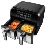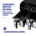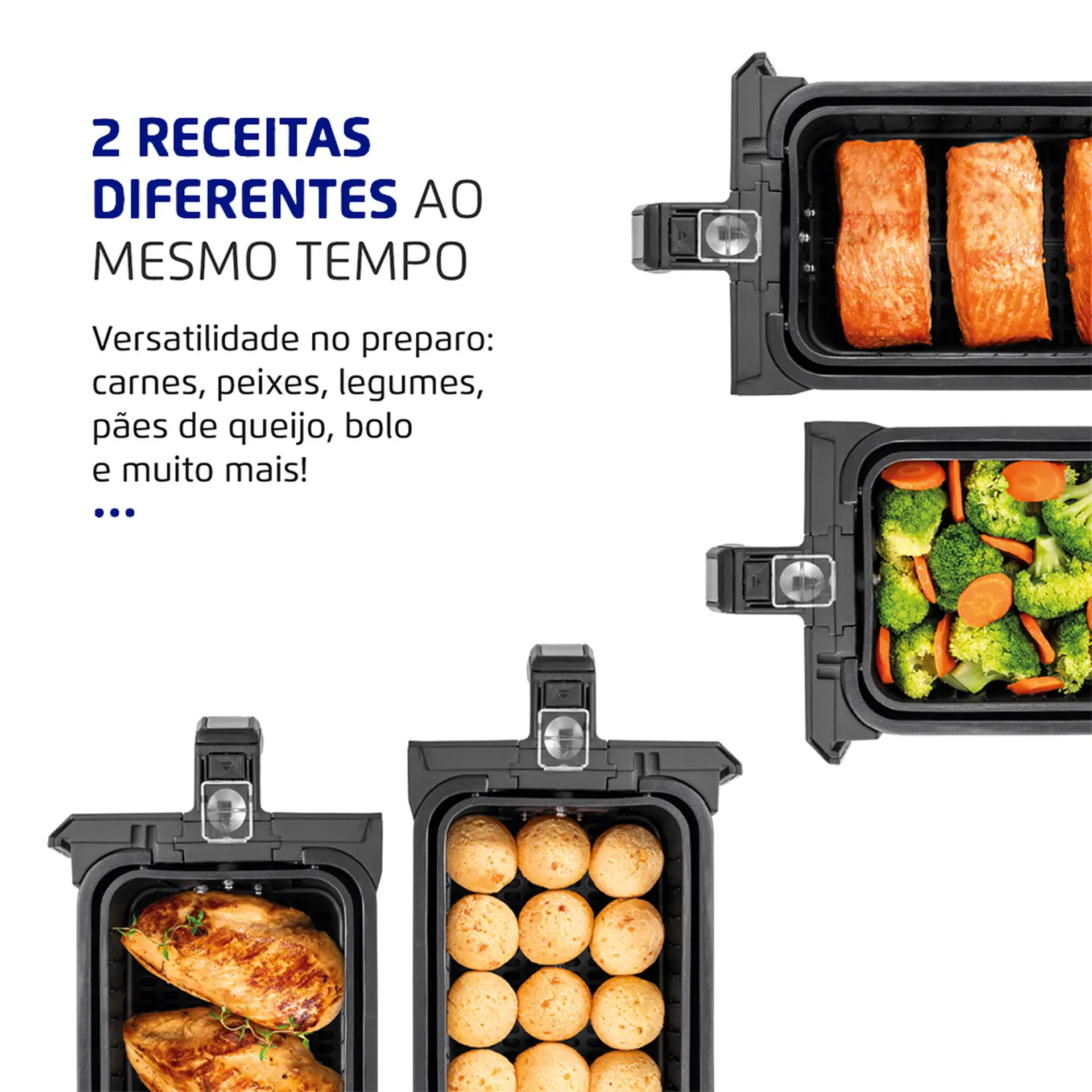 , que permitem preparar dois tipos de alimentos individualmente ao mesmo tempo, com regulagem de temperatura, tempo e muito mais, em seu incrível painel digital com