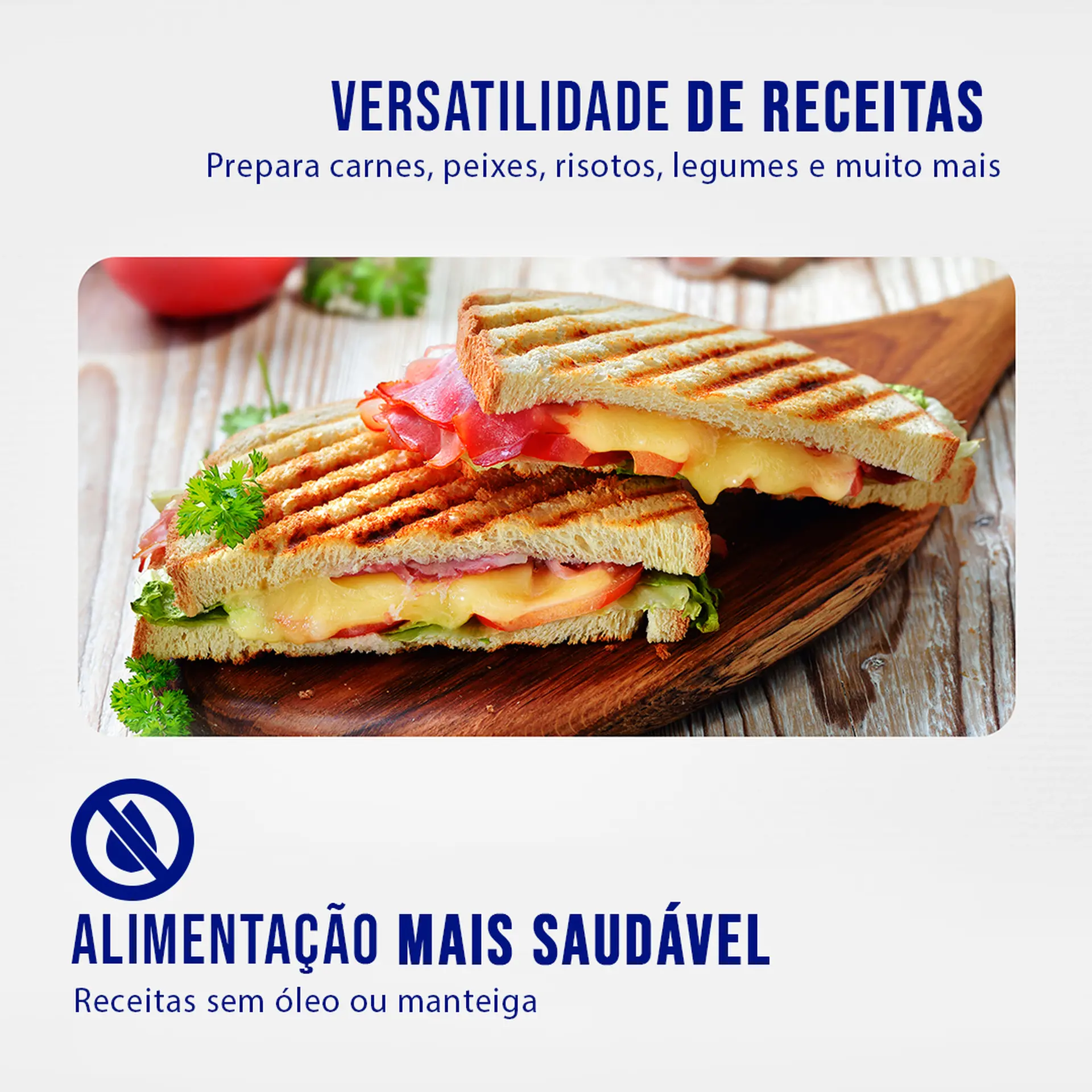 Versátil, o Master Press Inox funciona tanto como grill, quanto como sanduicheira. Você pode preparar carnes, peixes, vegetais, pães, hambúrguer, entre outros.