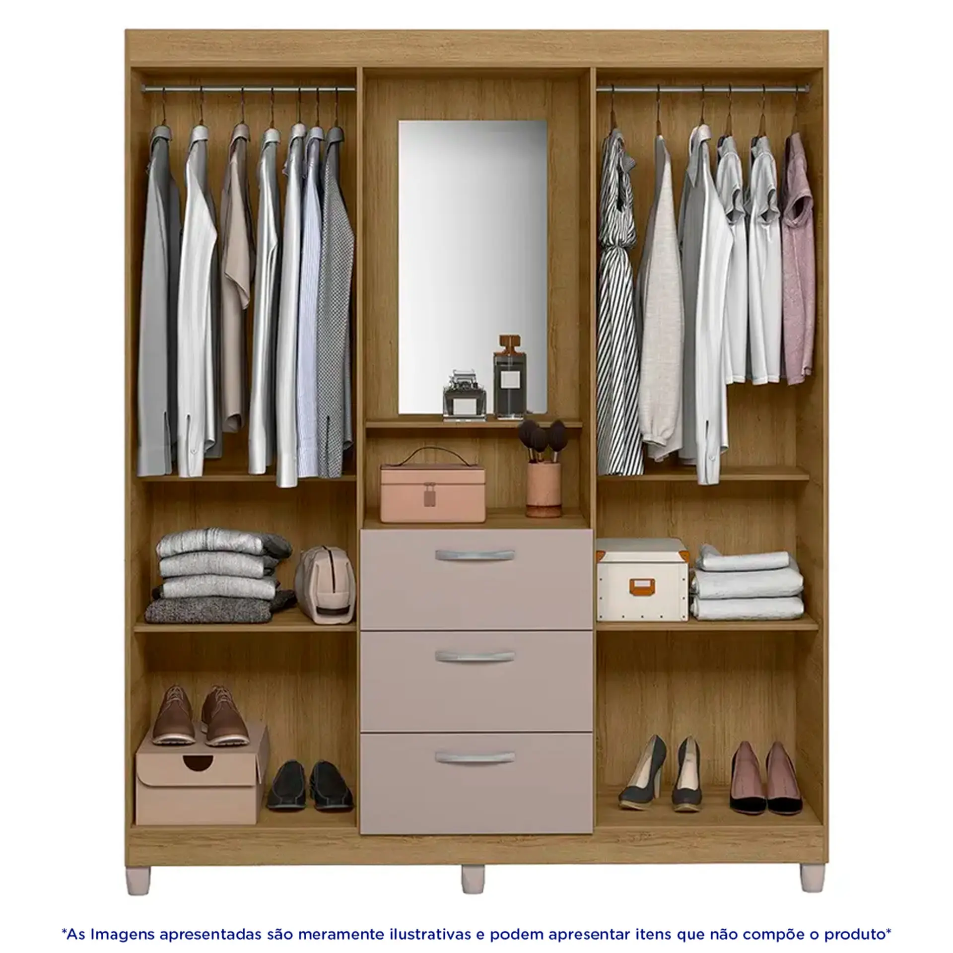 Com 3 gavetas, 1 cabideiro e prateleiras bem distribuídas, é perfeito para manter roupas, calçados e acessórios sempre organizados.