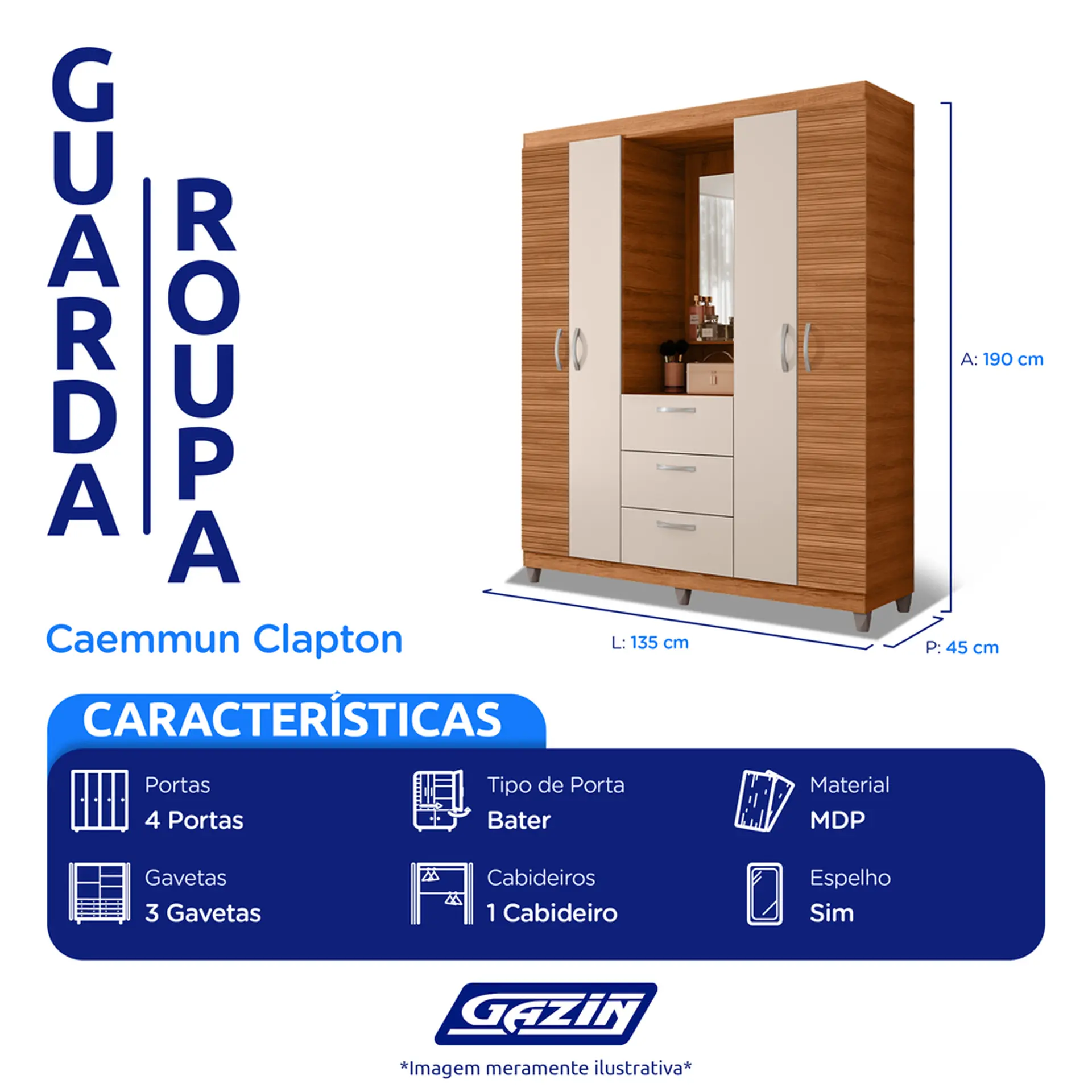 GUARDA-ROUPA SOLTEIRO 4 PORTAS BATER 3 GAVETAS CAPELINHA CLAPTON CAEMMUN