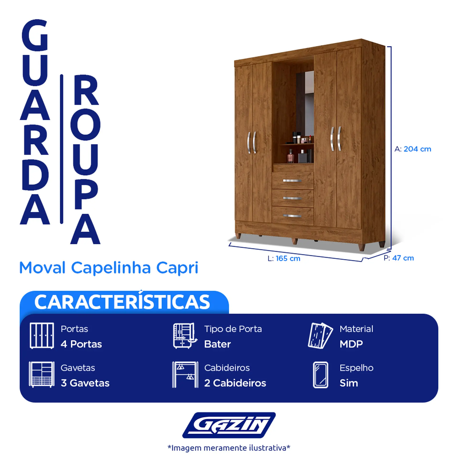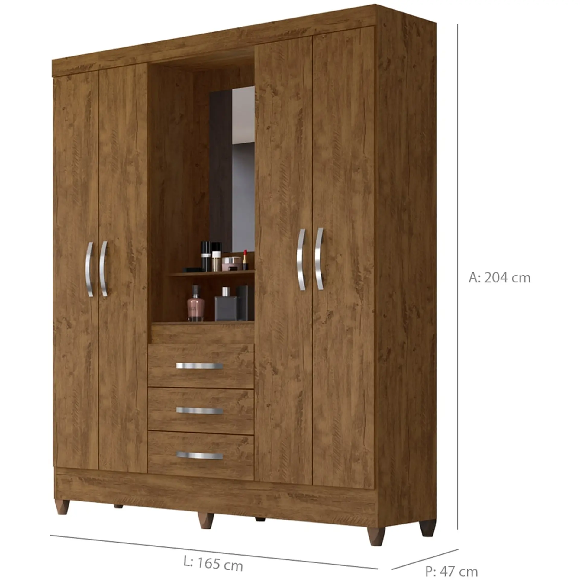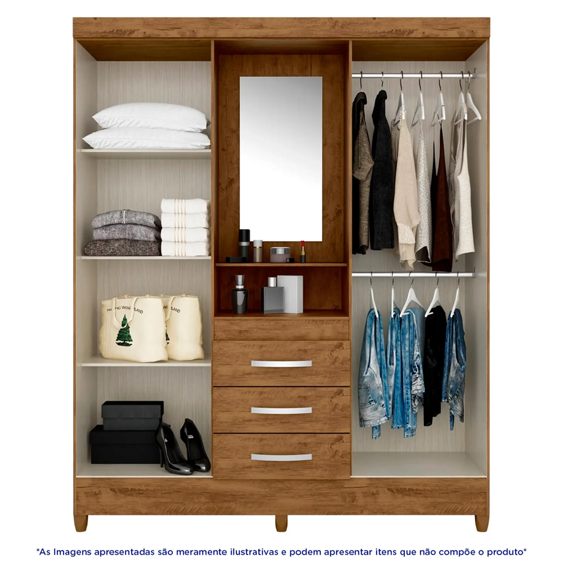 com um amplo espaço interno para manter suas roupas organizadas, além de 3 gavetas externas com rediças metálicas que possibilitam um deslize suave, conservando seu roupeiro. Quer mais? Acompanha um lindo espelho para você aproveitar como quiser!