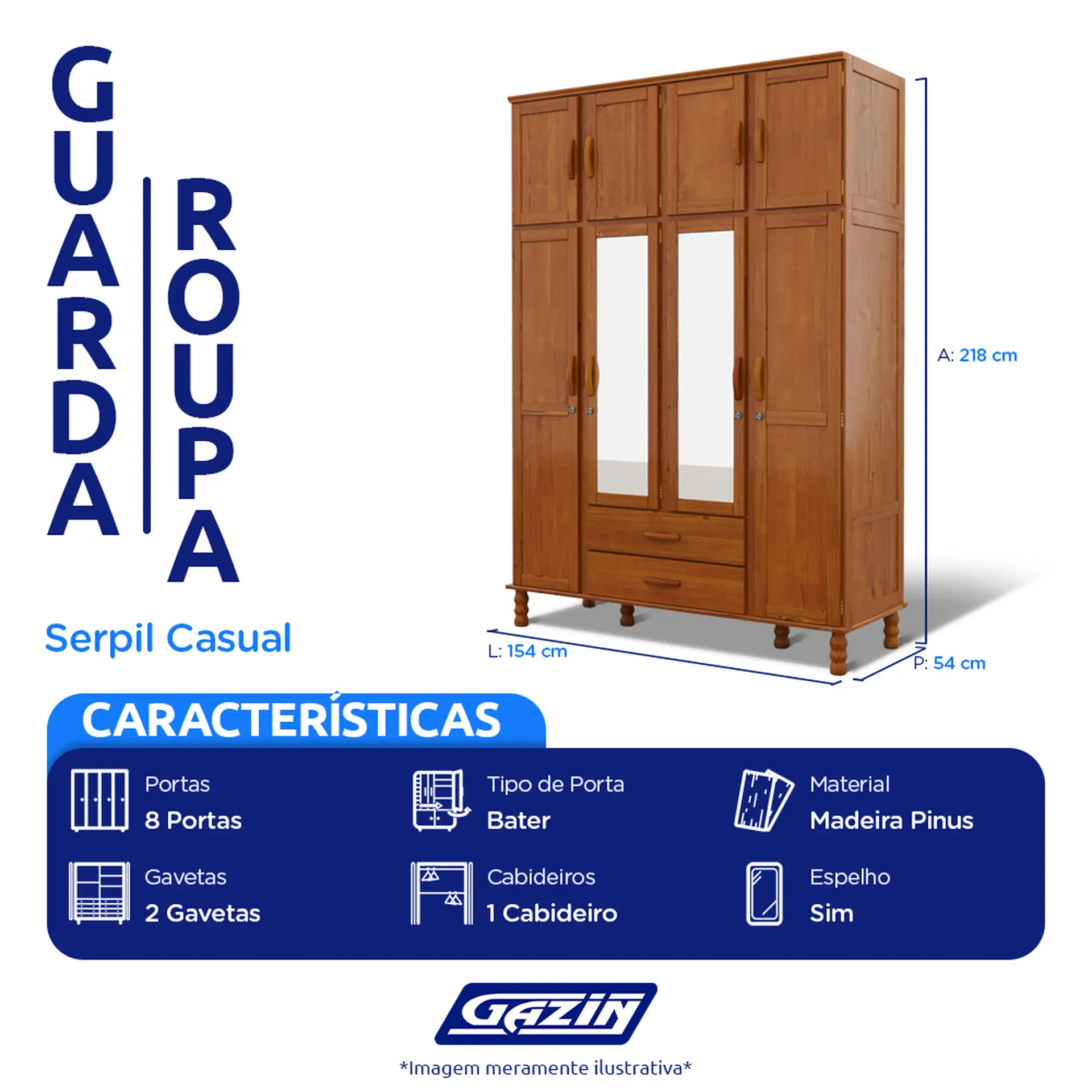 Se você já cansou de móveis que só preenchem um canto sem agregar valor à sua rotina, é hora de olhar para o essencial: organização com identidade. O Roupeiro Serpil Casual surge como uma resposta elegante e prática para quem busca um guarda-roupa funcional, com visual acolhedor e estrutura feita para durar, tudo isso com o charme da madeira reflorestada e a simplicidade que combina com qualquer estilo de quarto. Confira mais detalhes: Estrutura resistente e acabamento de qualidadeFabricado com madeira reflorestada de pinus, o roupeiro possui molduras laterais de 15 mm e lâminas internas em pinus taeda de 3,5 mm, proporcionando robustez e longa vida útil. As prateleiras internas, base, maleiro e laterais de gaveta são produzidas em MDP 15 mm, com acabamento acetinado que combina UV e PU, resultando em uma aparência sofisticada e agradável ao toque. A montagem é simples e o produto acompanha ferragens e manual detalhado, facilitando a instalação.Funcionalidade com charme e segurançaSão 8 portas de bater, com dobradiças metálicas simples, sendo que duas delas possuem espelhos de 3,5 mm, ideais para quem busca praticidade e amplitude visual no ambiente. O modelo inclui ainda 2 gavetas com rediças metálicas suaves, cabideiro em madeira revestido em PVC e 3 prateleiras internas, cada uma com capacidade para até 9 kg estáticos. O design também conta com puxadores em madeira maciça reflorestada e portas reversíveis, além de chave de segurança na porta central.Base elevada e detalhes que fazem a diferençaOs pés em madeira de pinus reflorestado medem 16 cm de altura e proporcionam estabilidade, além de facilitar a limpeza da área abaixo do móvel. Ideal para compor desde dormitórios mais compactos até ambientes amplos, o Roupeiro Serpil Casual se destaca pela combinação entre resistência estrutural, beleza natural da madeira e soluções práticas que atendem às rotinas modernas.Sobre a marca: qualidade Serpil!Há mais de três décadas, a Serpil surgiu com um objetivo bem definido: transformar boas ideias em soluções que unissem qualidade, inovação e respeito ao meio ambiente. O que nasceu como um projeto sonhador e determinado, hoje se consolidou como o Grupo Serpil, formado pelas marcas Serpil Móveis e Serflex Colchões. Com uma estrutura industrial que ultrapassa 22 mil m² e o envolvimento de cerca de 300 colaboradores, a empresa cresceu de forma sólida e responsável, sempre olhando para frente. Seu compromisso com o meio ambiente é refletido na escolha por madeira 100% de reflorestamento na fabricação de móveis, e pela aplicação de tecnologia de ponta no desenvolvimento de colchões pensados para oferecer conforto e bem-estar.Mais do que apenas produtos, a Serpil entrega propostas que melhoram o cotidiano e incentivam um consumo mais consciente.