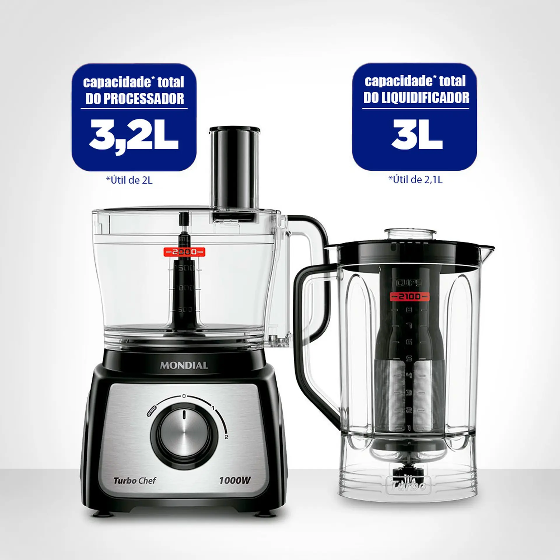 A capacidade útil de 2,1 litros. O item é ideal para preparar sucos, vitaminas, caldos, molhos, bolos, entre outros.