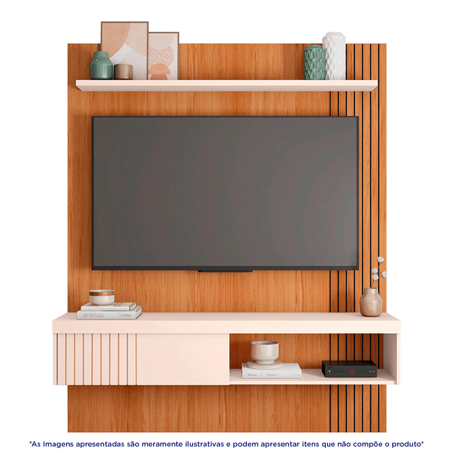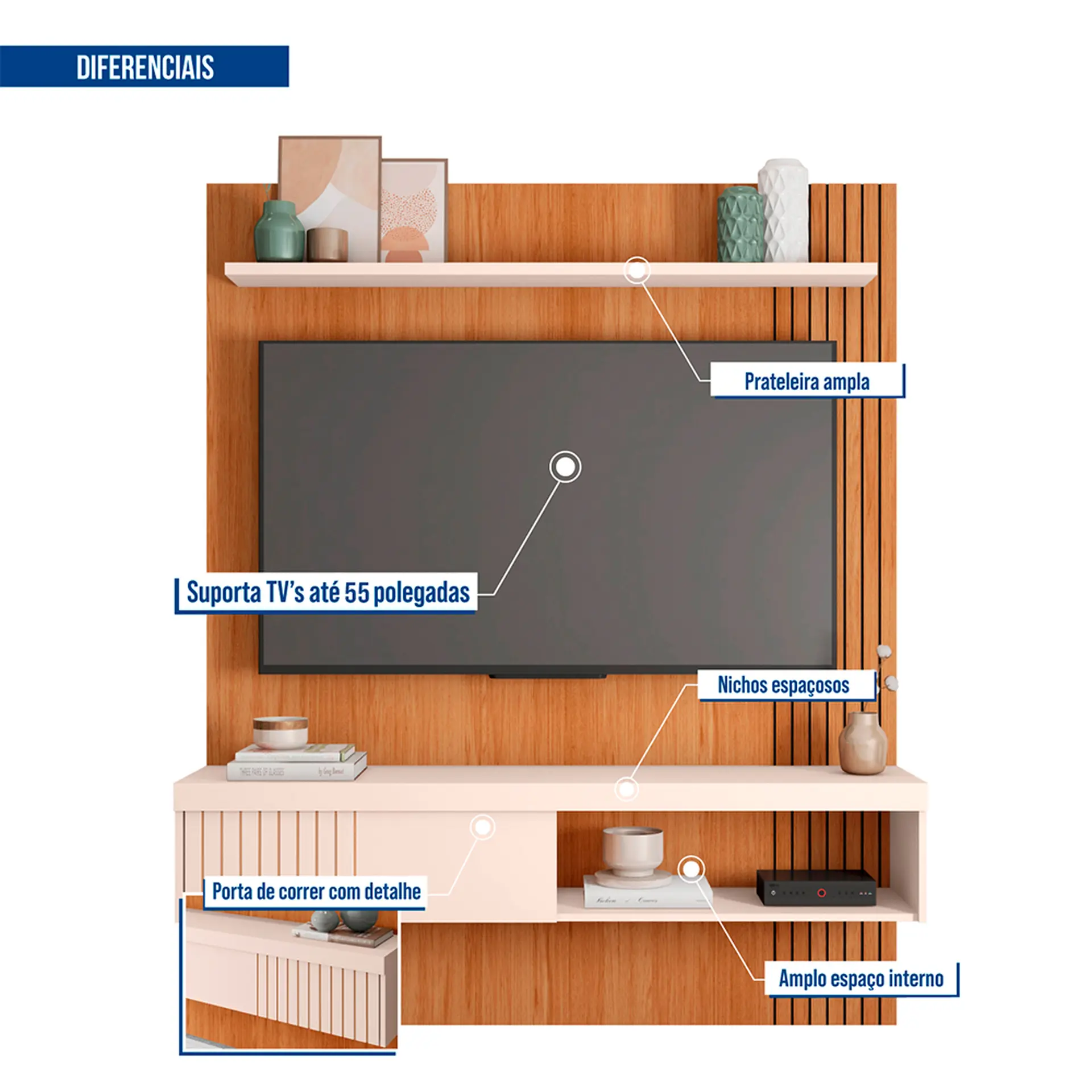 . Com detalhes modernos na lateral ripada em baixo relevo, o painel suporta uma