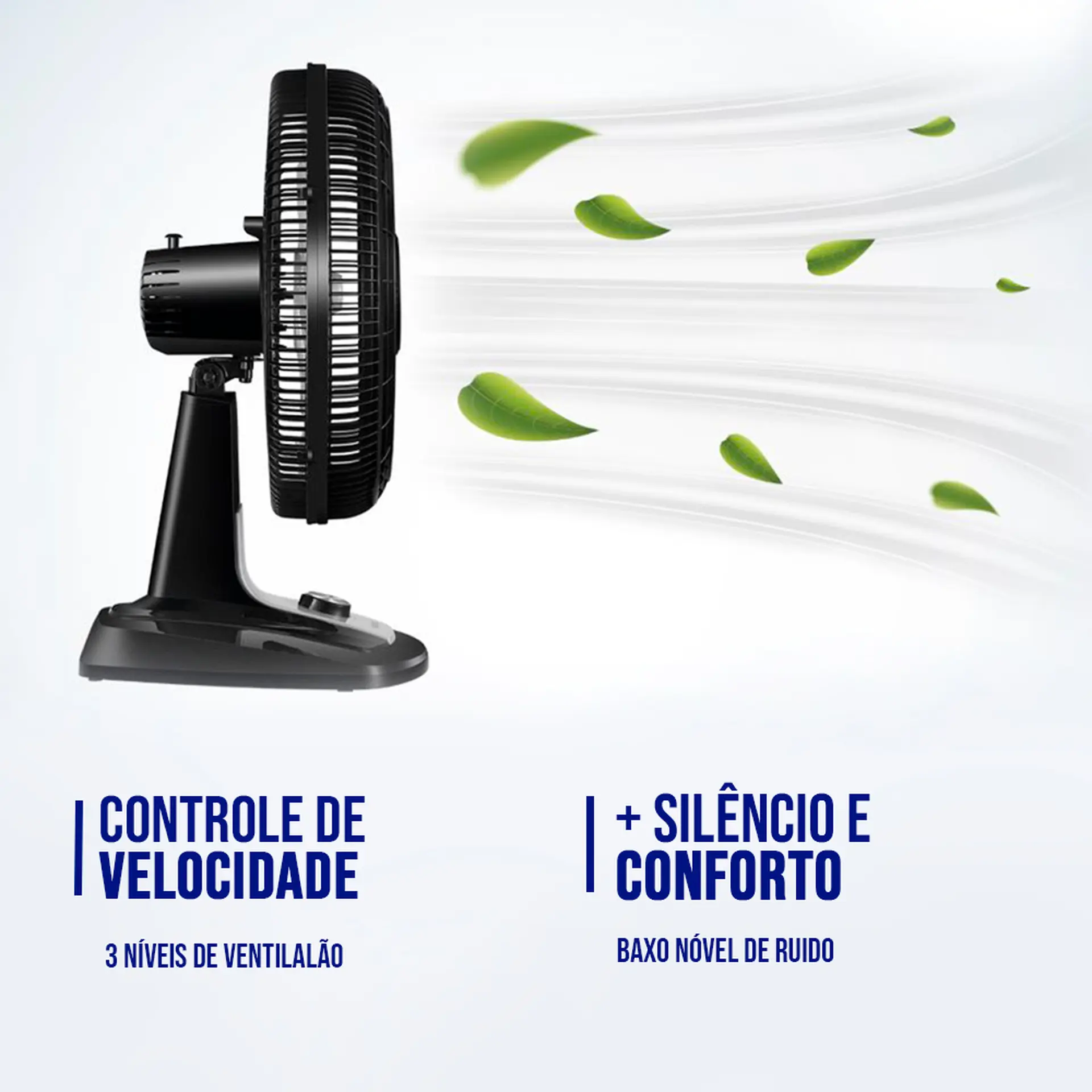 As 3 opções de velocidade permitem adequar o vento à sua necessidade: Máxima Turbo, Média Conforto e Mínima Silencioso.