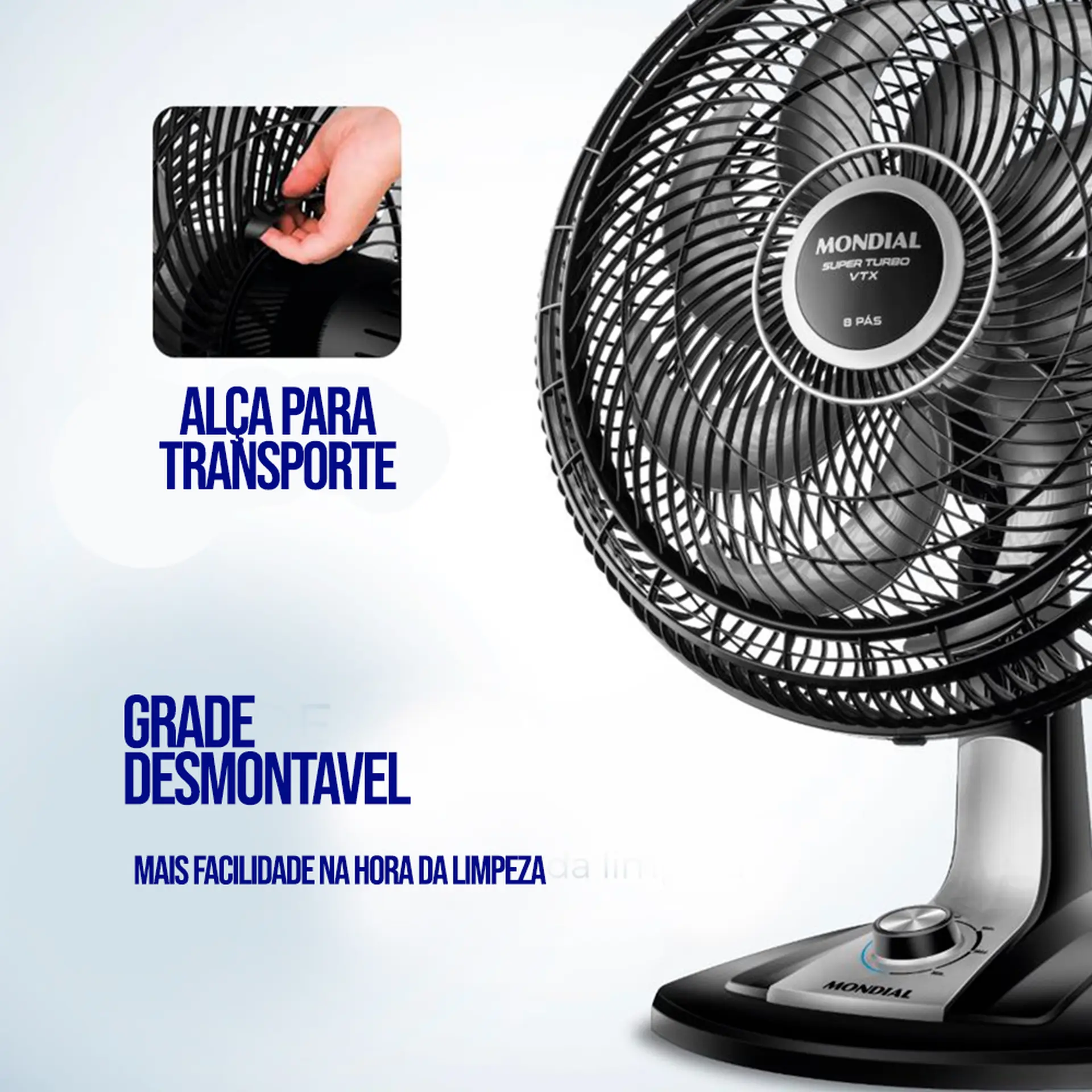 O ventilador de mesa Super Turbo VTX-40-8P possui 40 cm de diâmetro e hélice de 8 pás, o que promove uma circulação de ar mais eficiente e garante mais fres ao ambiente. O sistema de ventilação alia a potência para refrescar ao baixo nível de ruído, proporcionando o silêncio necessário para momentos de concentração e uma excelente noite de sono. Saiba mais sobre o VTX-40-8P da Mondial: